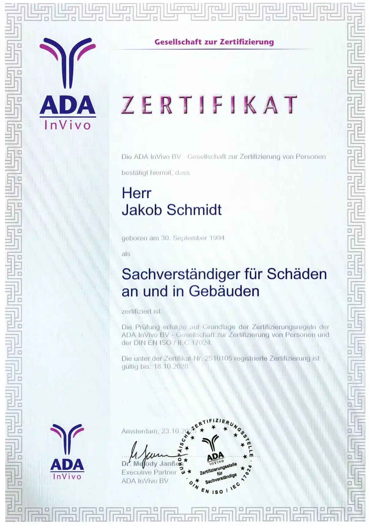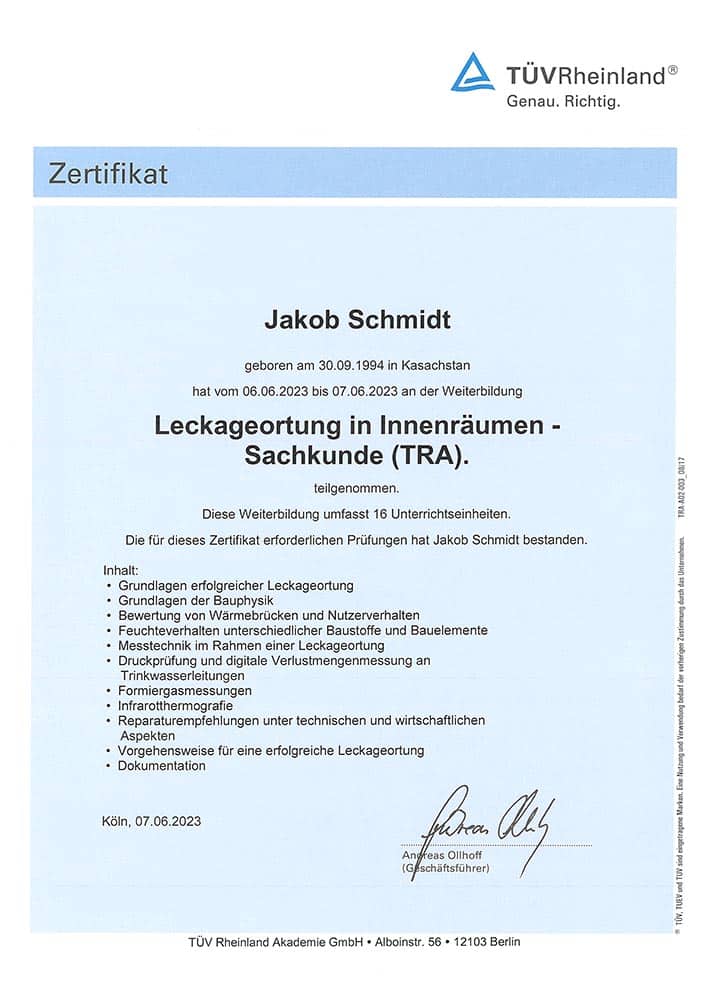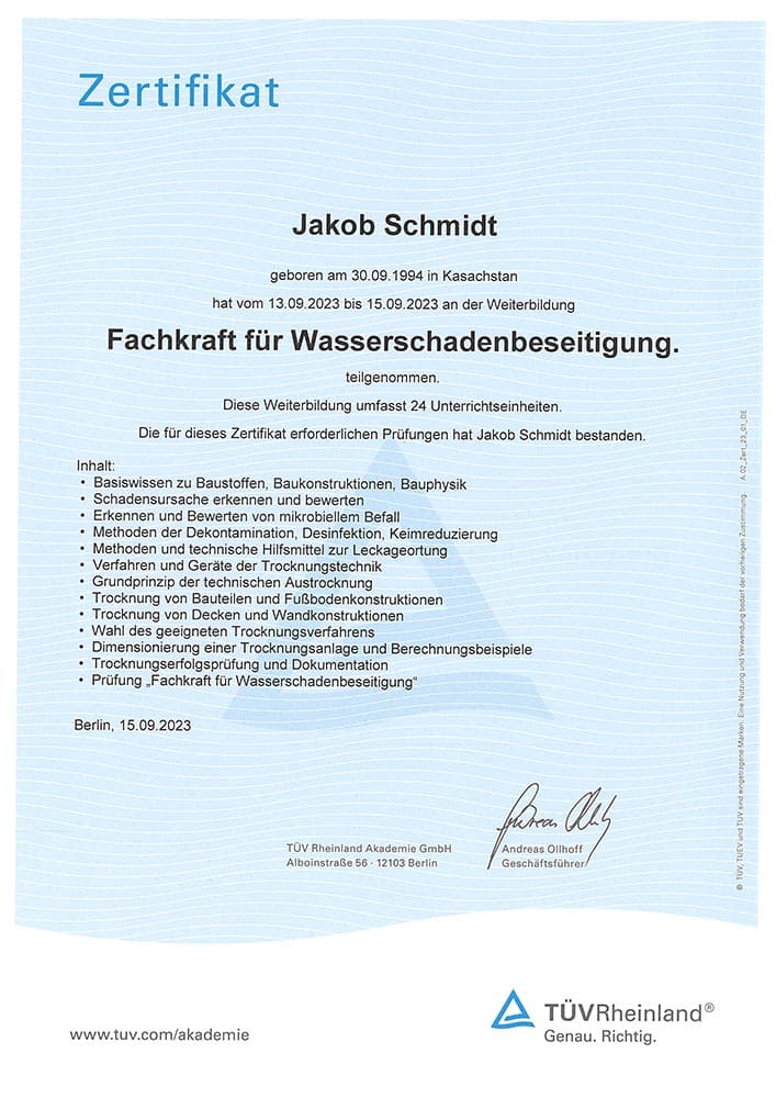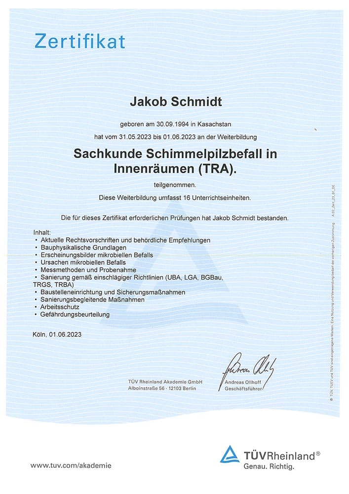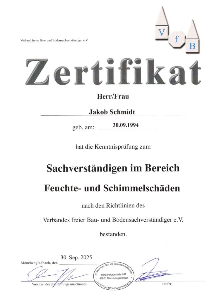 Unser Geschäftsführer ist verbandsgeprüfter Bausachverständiger für Schäden an und im Gebäude, alle Fachqualifikationen sind TÜV-zertifiziert.