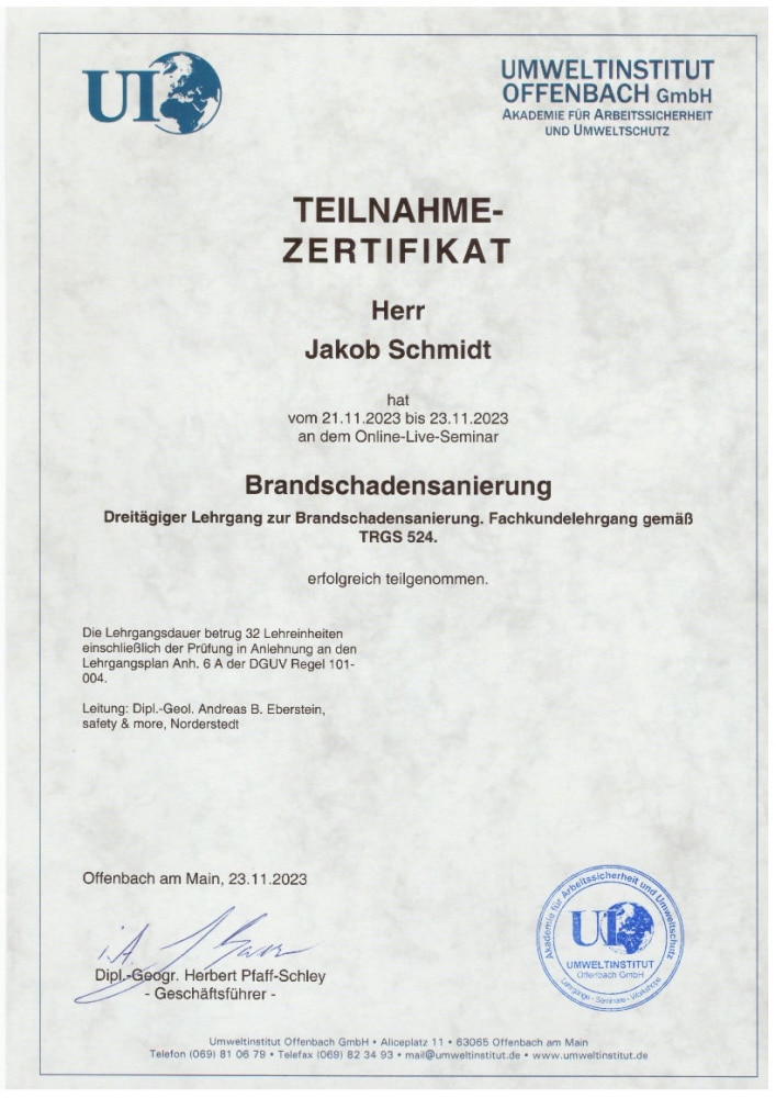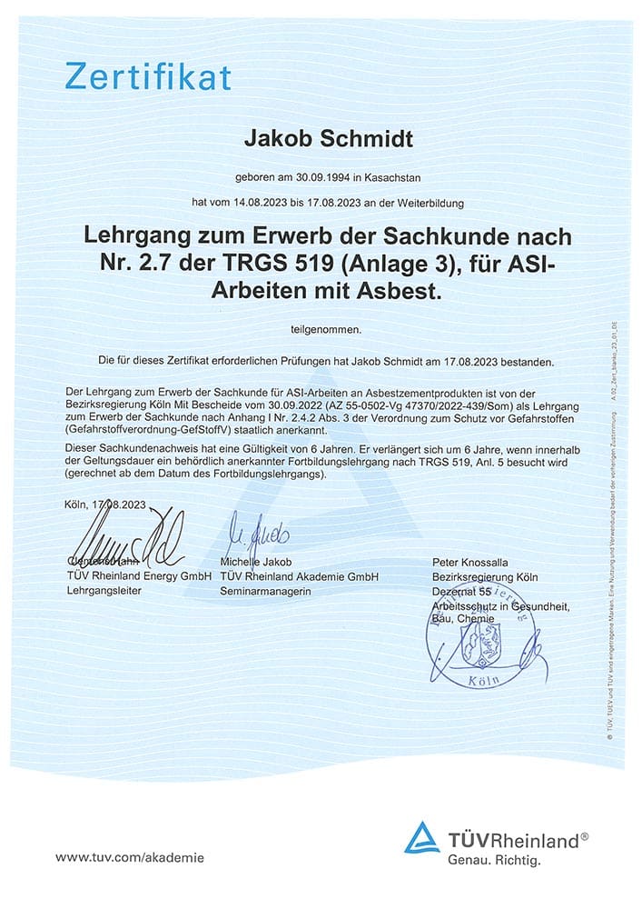 Unser Geschäftsführer ist zertifizierter Bausachverständiger. Unsere Einsatzleitung ist erfahren in der Baustellenkoordination. Alle Mitarbeitenden sind geschult und regelmäßig weitergebildet – inklusive TÜV-Zertifizierungen.